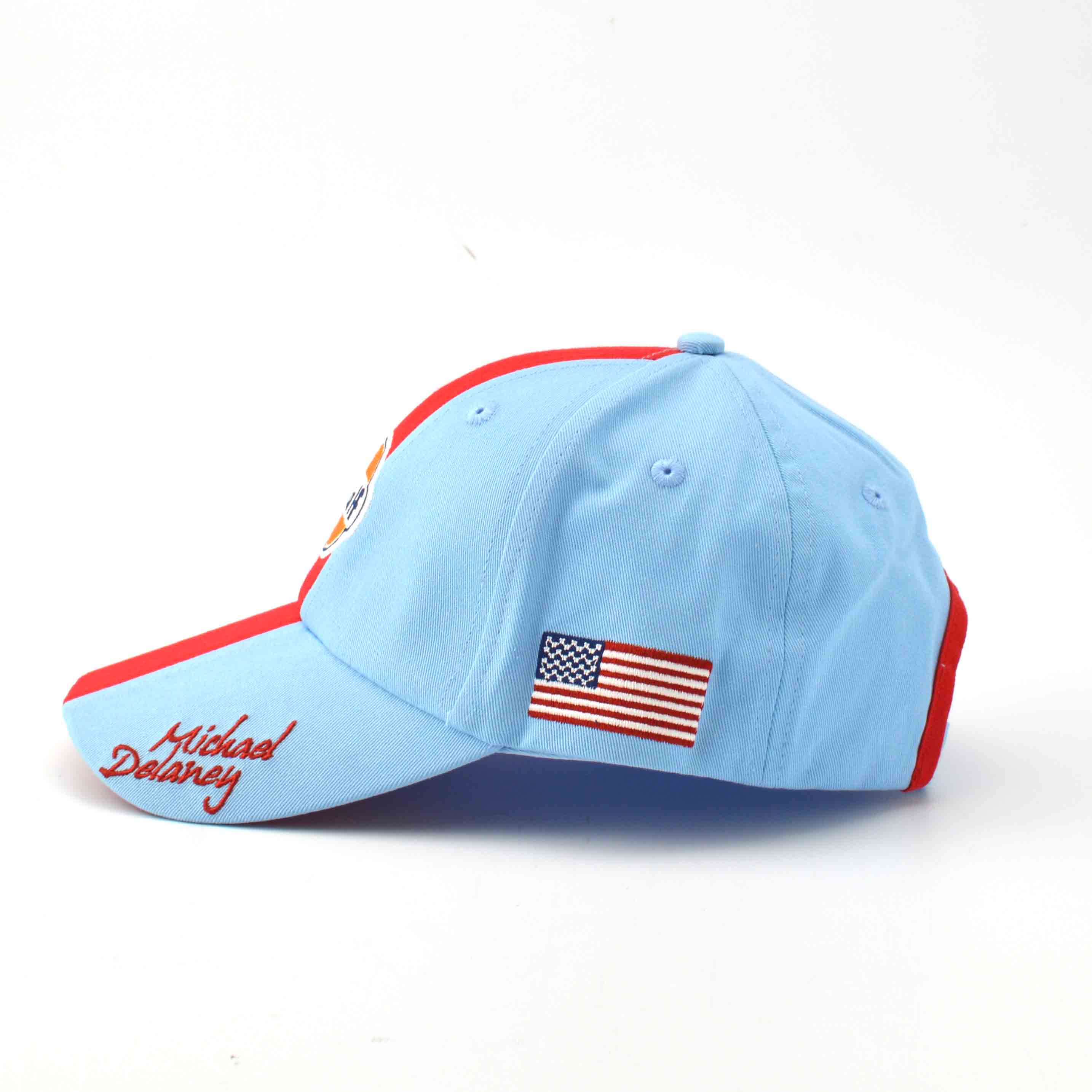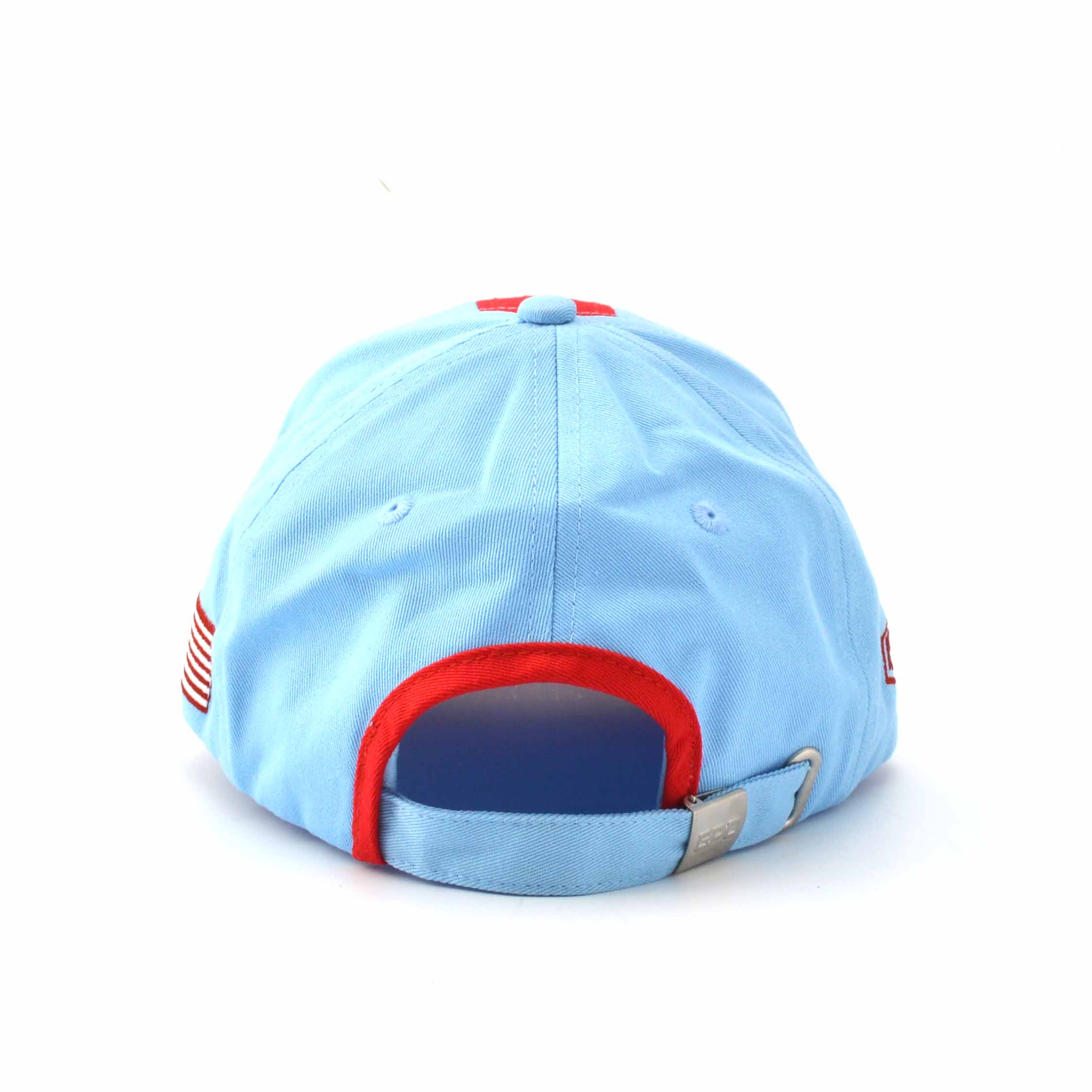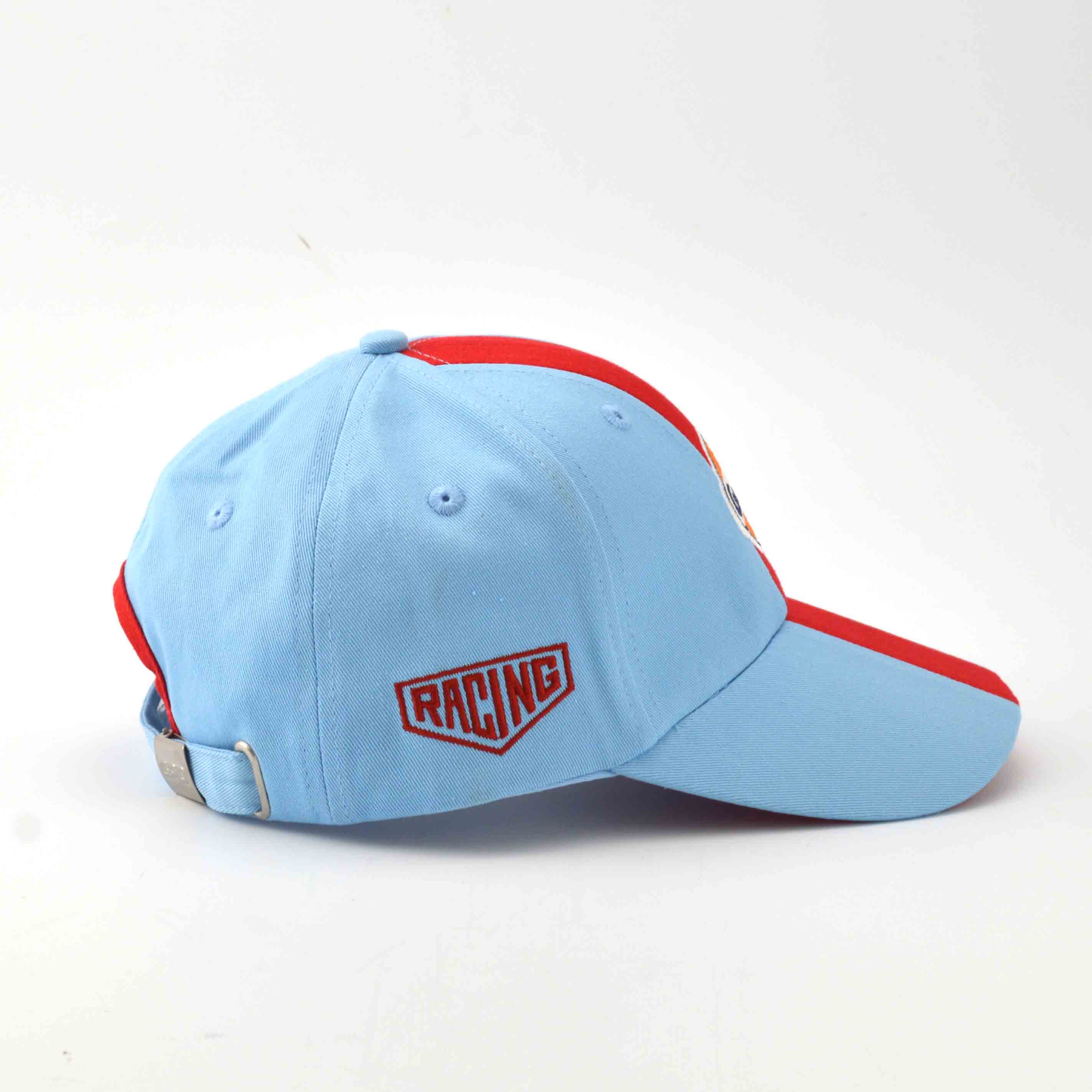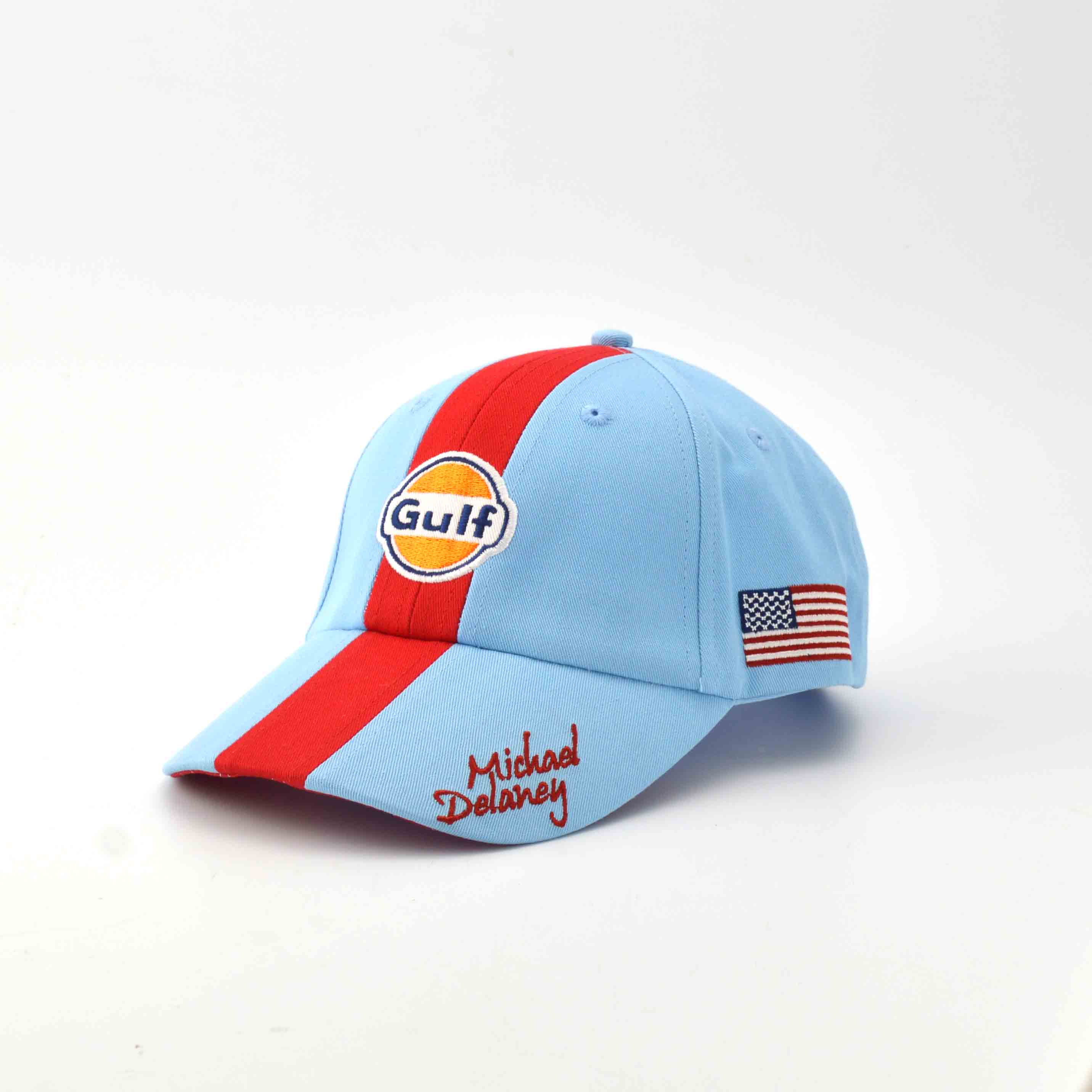 センターの赤いラインが目を引くキャップ。正面にGulfのロゴ、左サイドに星条旗、右サイドにはRACINGのロゴが刺繍されています。そしてツバには、映画「栄光のル・マン」でスティーブ・マックイーンが演じた主人公、マイケル・ディレイニーのネーム入りです。