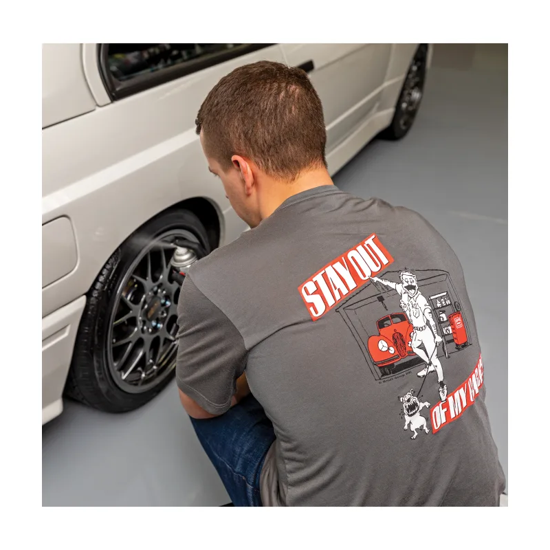 左胸には「GRIOT'S GARAGE」のロゴを、背面には「Stay Out Of My Garage!」のメッセージを昔風にアレンジしてプリントしたTシャツです。