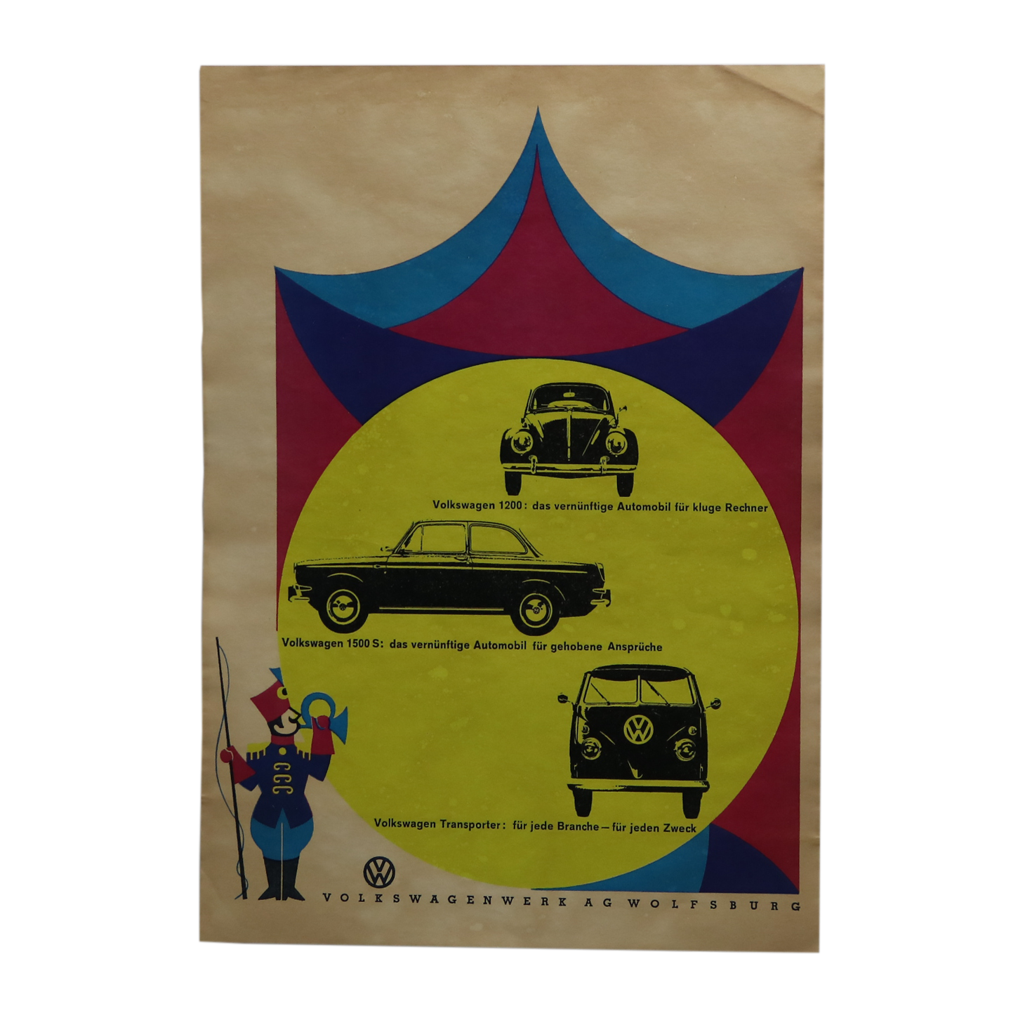 フォルクスワーゲンの創業期を象徴するモデルのビートル(タイプ1)、トランスポーター(タイプ2)、1500S(タイプ3)が描かれています。