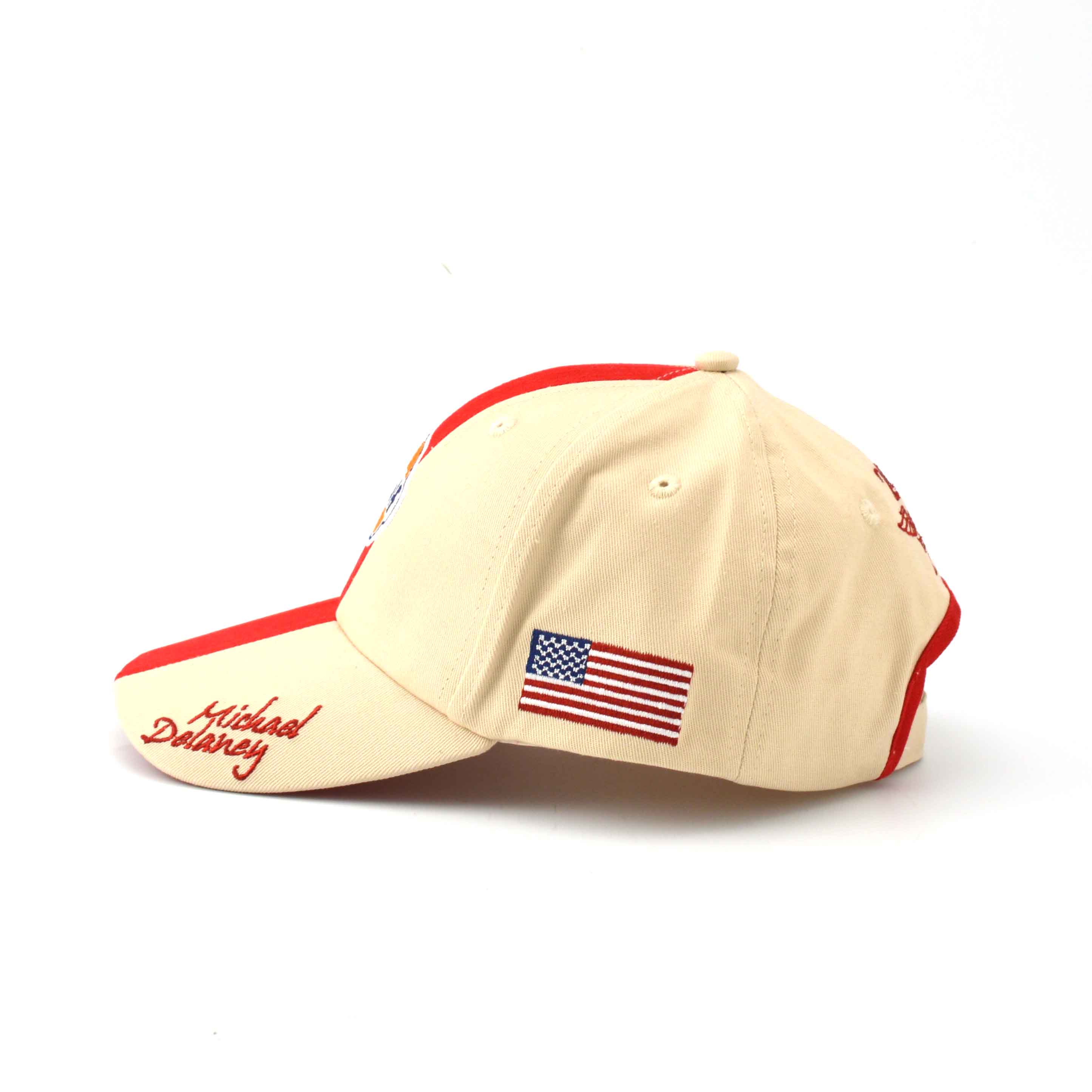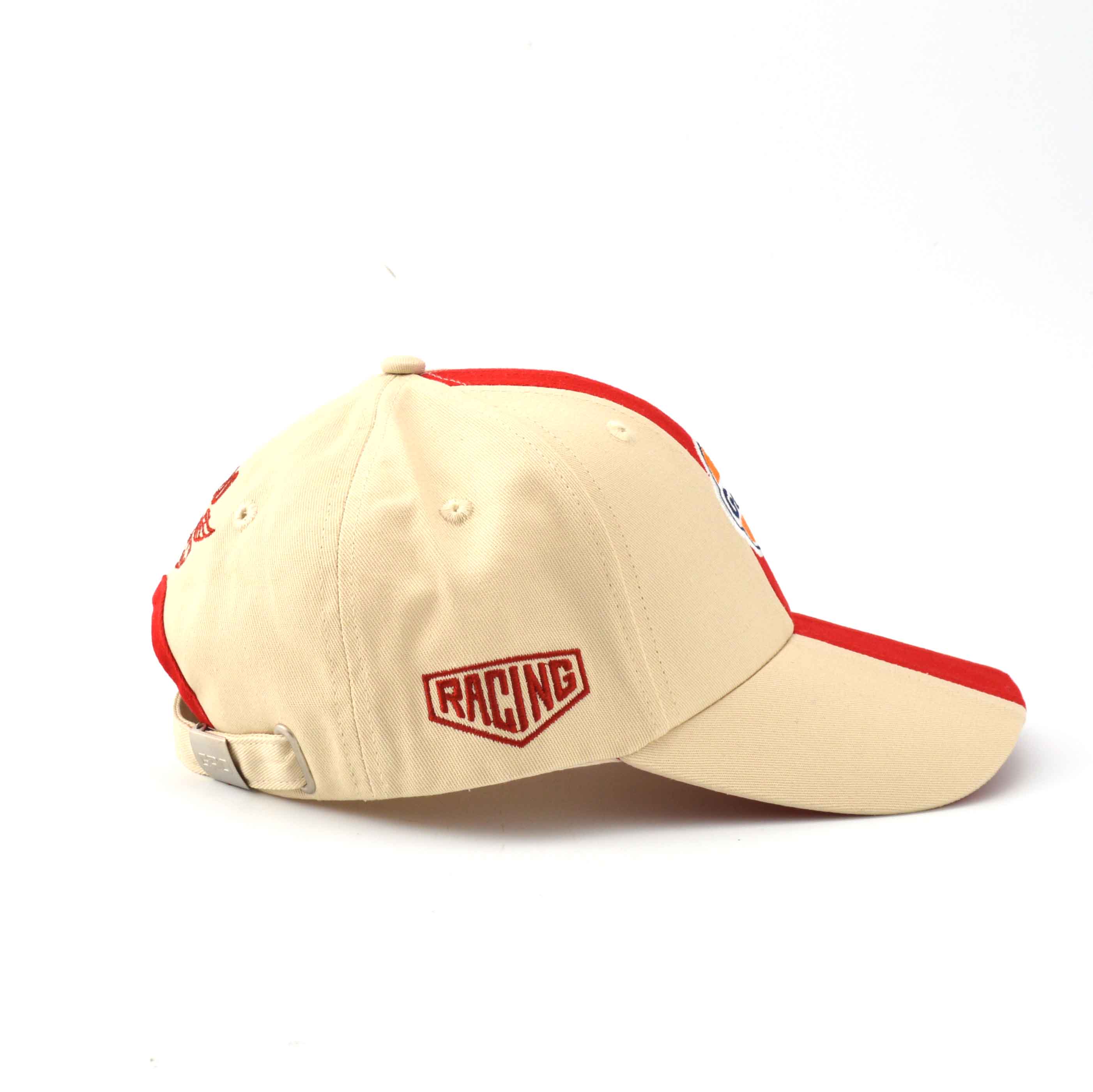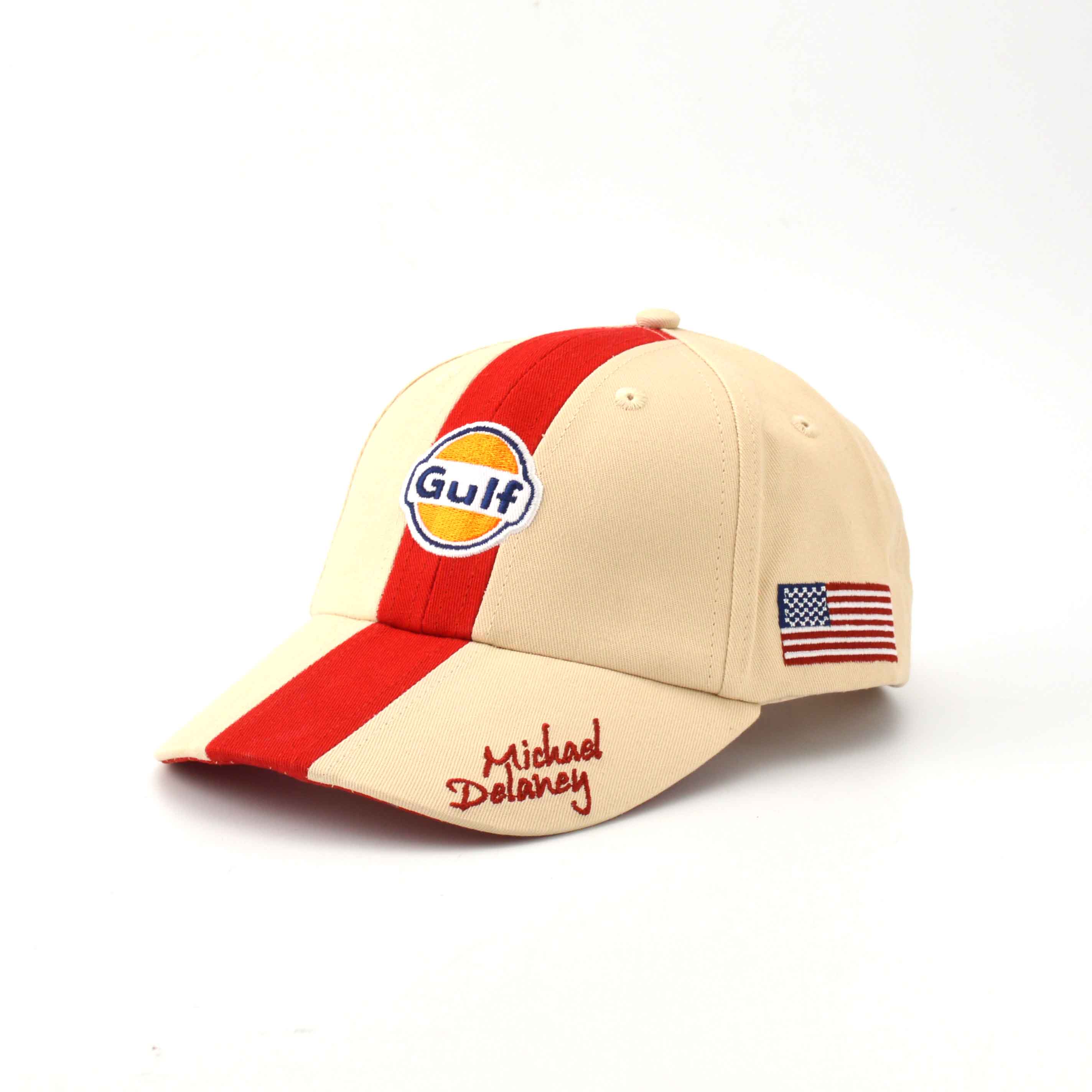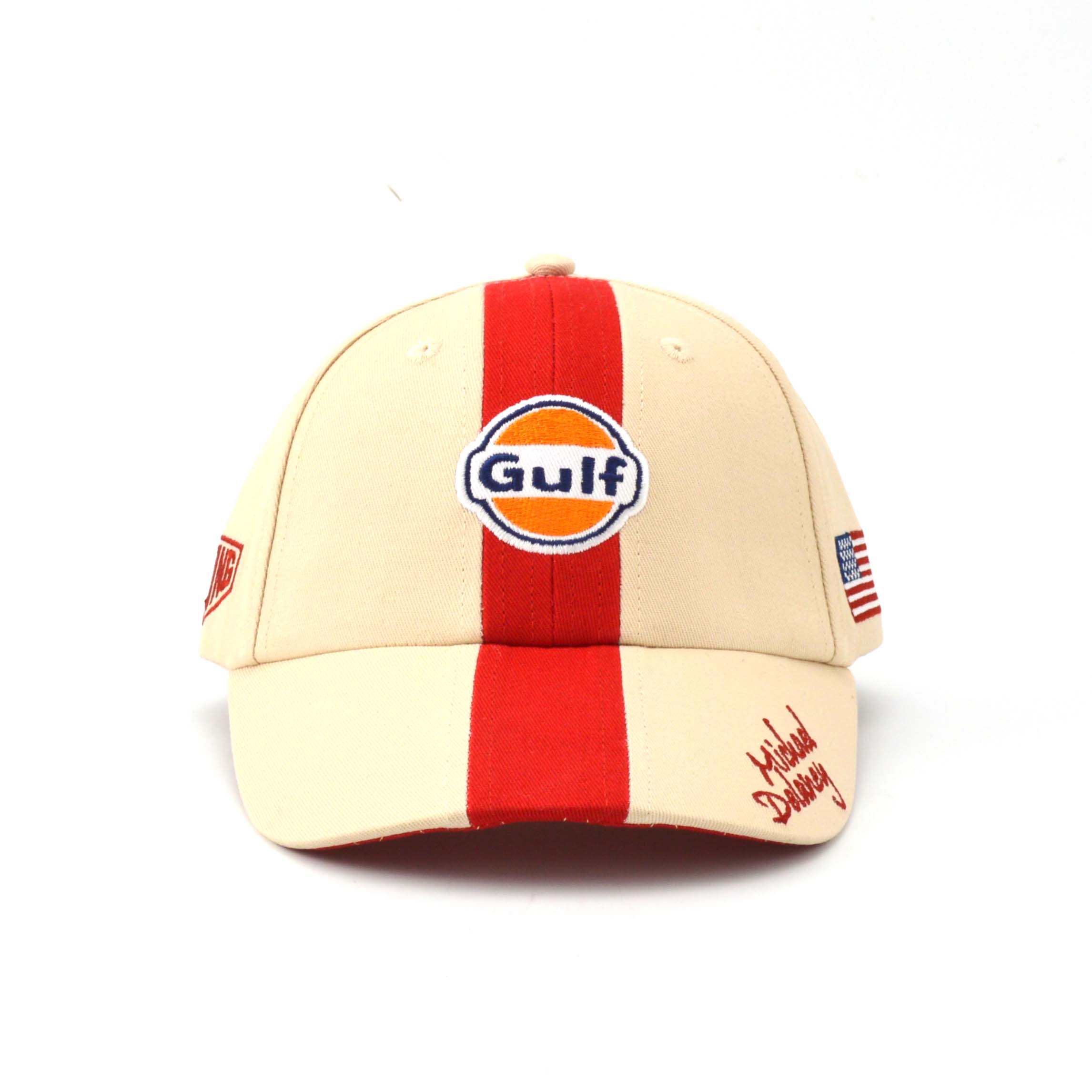 センターの赤いラインが目を引くキャップ。正面にGulfのロゴ、左サイドに星条旗、右サイドにはRACINGのロゴが刺繍されています。そしてツバには、映画「栄光のル・マン」でスティーブ・マックイーンが演じた主人公、マイケル・ディレイニーのネーム入りです。