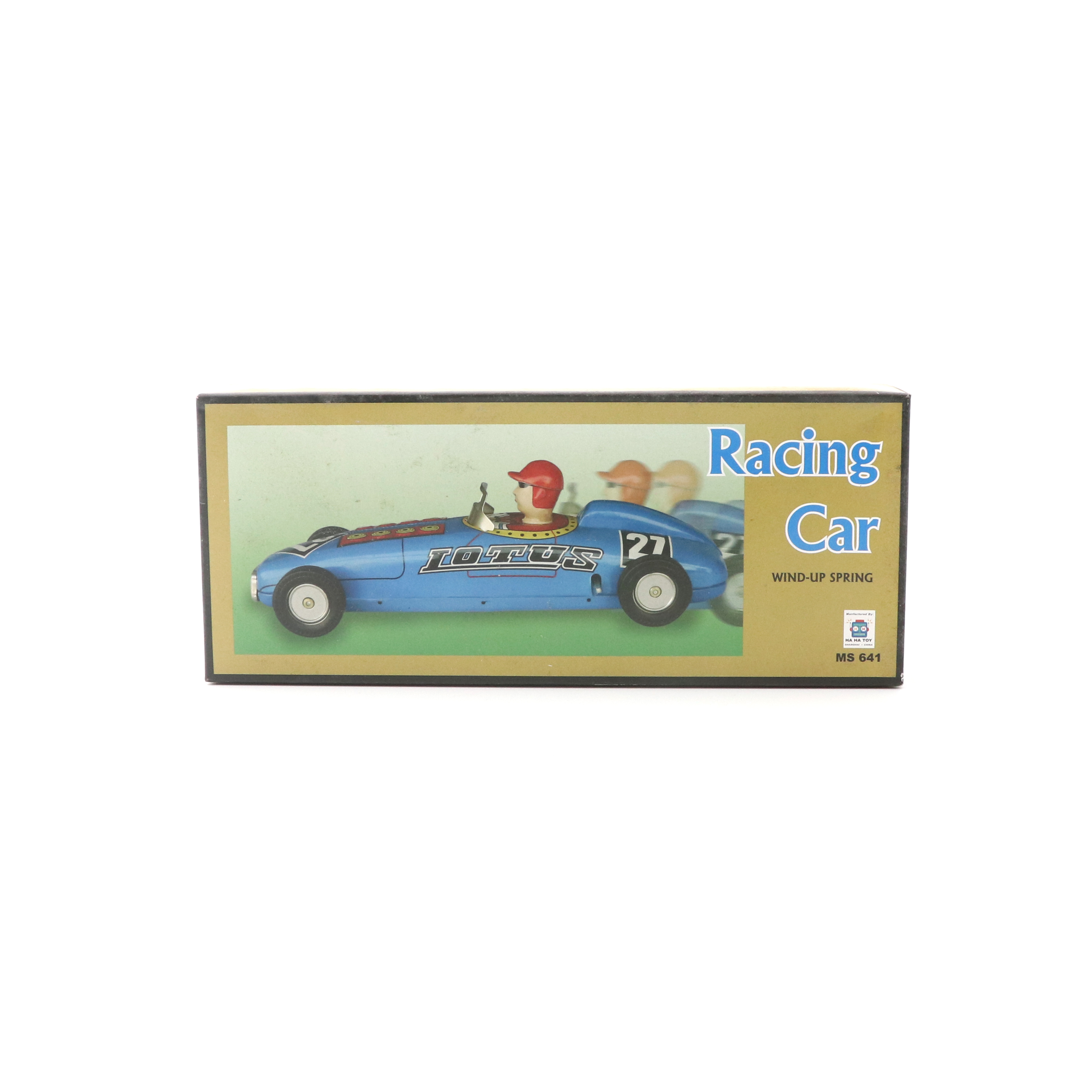 ゼンマイを巻くと、レーシングカーが勢いよく走り出します。低く構えたフォルムと、風を切るようなドライバーの姿が印象的。