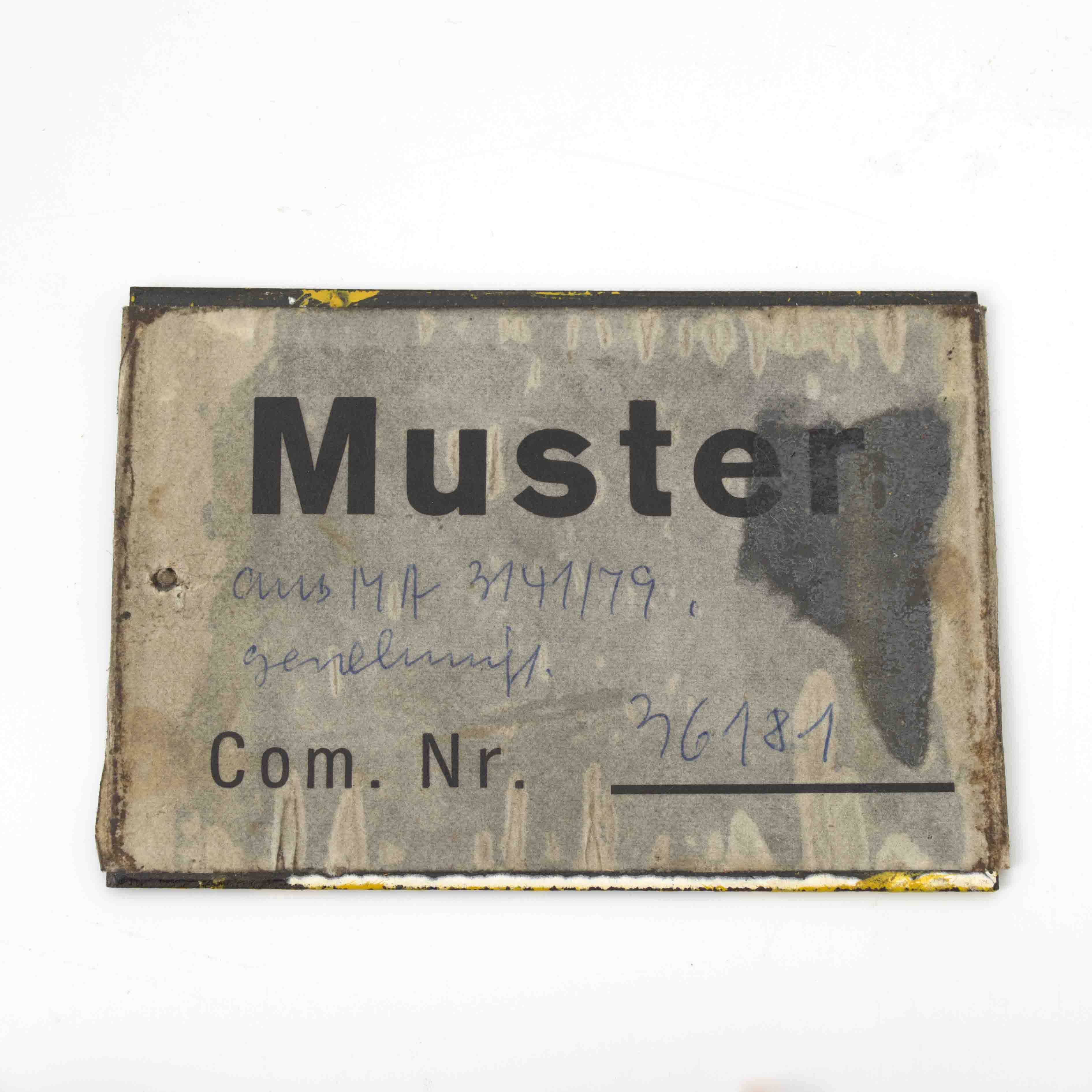 裏には「Muster」 = 見本/サンプル、「Com. Nr. 36181 」= 管理番号(または製造番号)36181、手書きで「1979年1月31日付で承認済み」とあります。