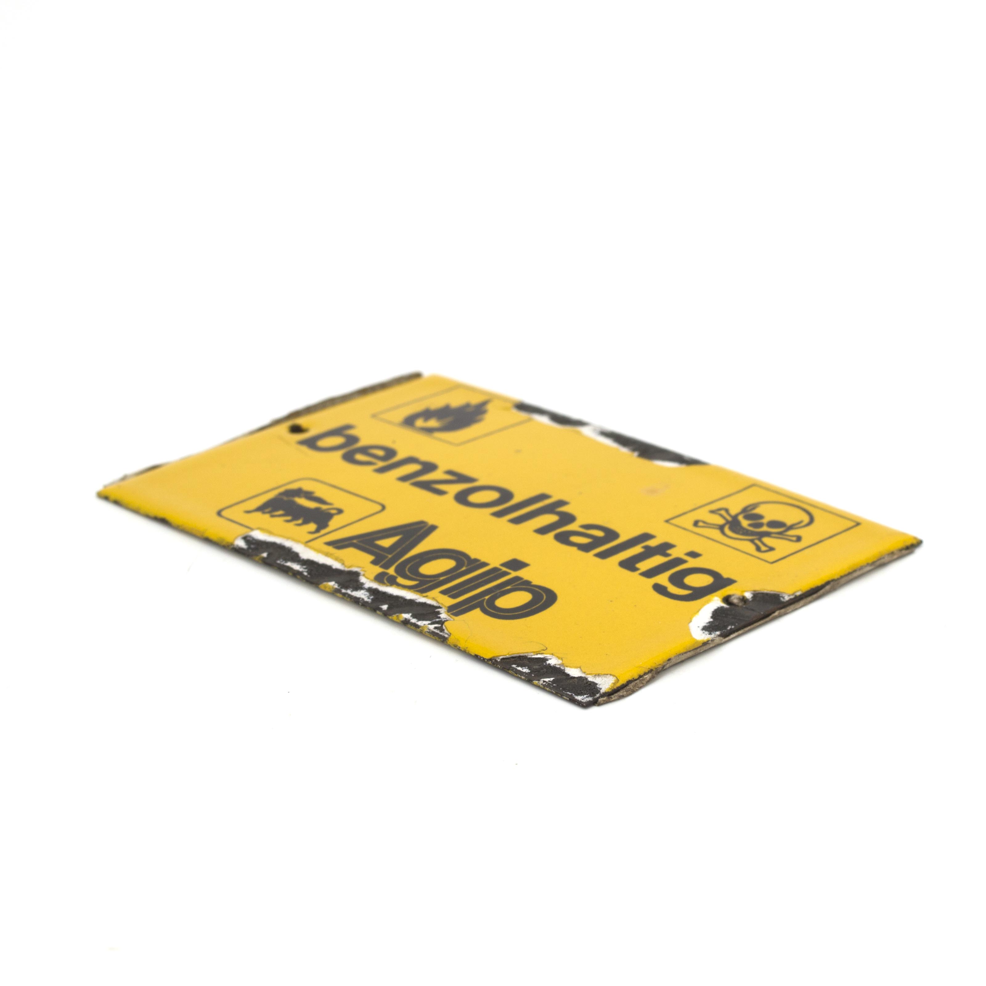 「benzolhaltig」=ベンゼンを含む、という意味の単語に、可燃性を示す炎のマークと、有毒性を示すドクロのマークが描かれた、ミニサイズの警告看板です。