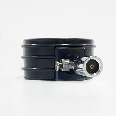 エアバルブに片手で簡単に挿せるストレートチャック形状。計測値はリセット&減圧ボタンを押すまで残るので、途中で数値がわからなくなる心配もありません。